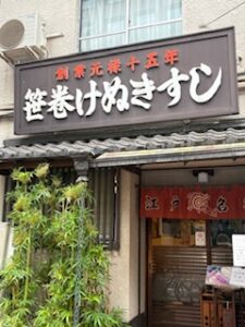 「笹巻けぬきすし」について少し書きたい。「けぬき」の由来は、魚の小骨を毛抜きで一本いっぽん丁寧に抜いたからだという。元禄15年創業だそうだ。年末に赤穂浪士の討ち入りがあった年である。元禄15年は西暦だと1702年だから320年余りの歴史があることになる。のれんには「江戸名物」と書かれている。